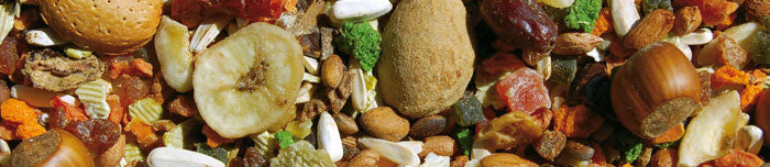 A mix with dessicated fruit, dried fruit, legumes, extruded feed, and seeds. Visually appealing and fun, a real treat for parrots.